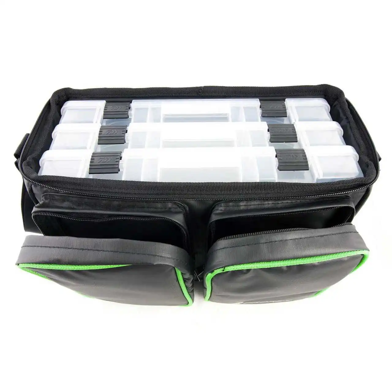 In den beiden Fronttaschen der ProRex Kunstködertasche ist genug Platz vorhanden, um Kleinteile-Boxen für Wirbel, Jighaken & Co darin unterzubringen