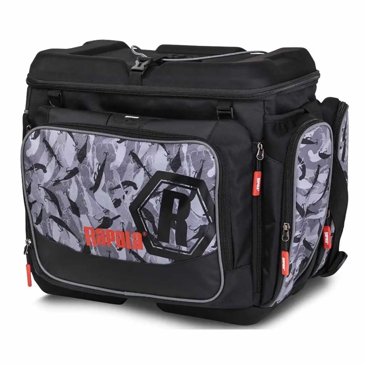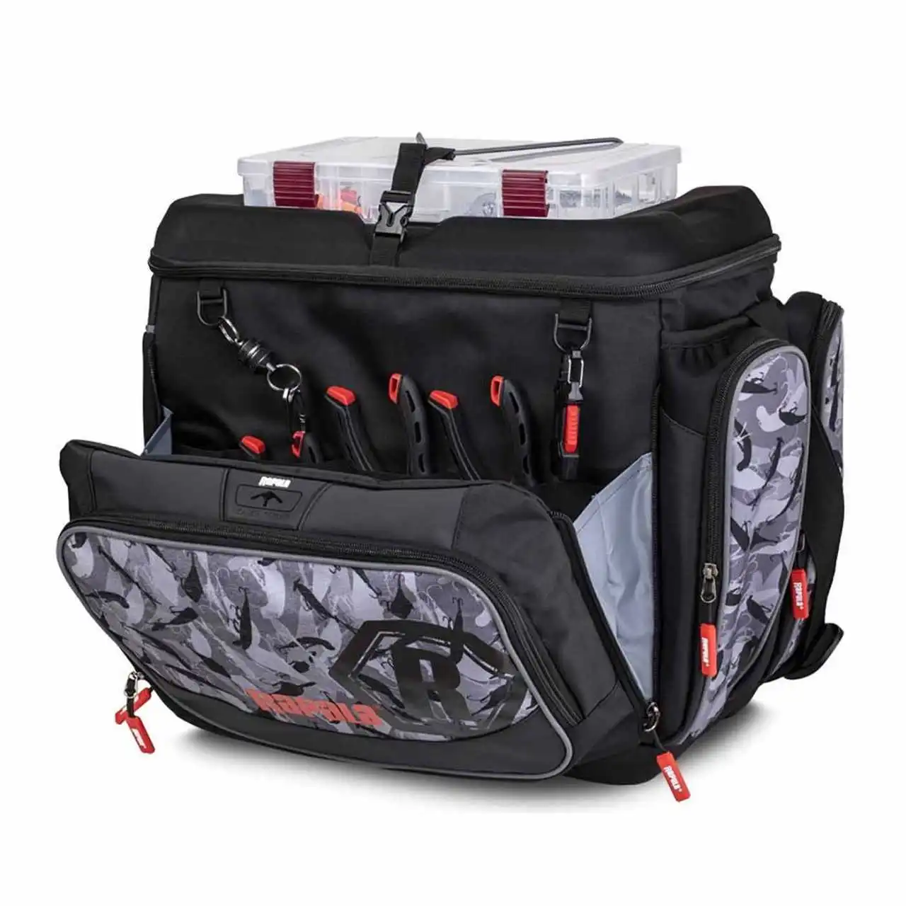 Wasserdichtes Rapala-Gewebe im LureCamo-Design und ein strapazierfähiger EVA-Boden, um das Eindringen von Wasser zu verhindern. Platz für sieben Tackle-Boxen der Größe 3700 in der Tasche plus eine achte für den Schnellzugriff auf der Oberseite. Die mehrschichtige Fronttasche bietet einen sicheren Werkzeugspeicher, der sich weit öffnen lässt, Reißverschlusstaschen für Vorfächer und Organizer.